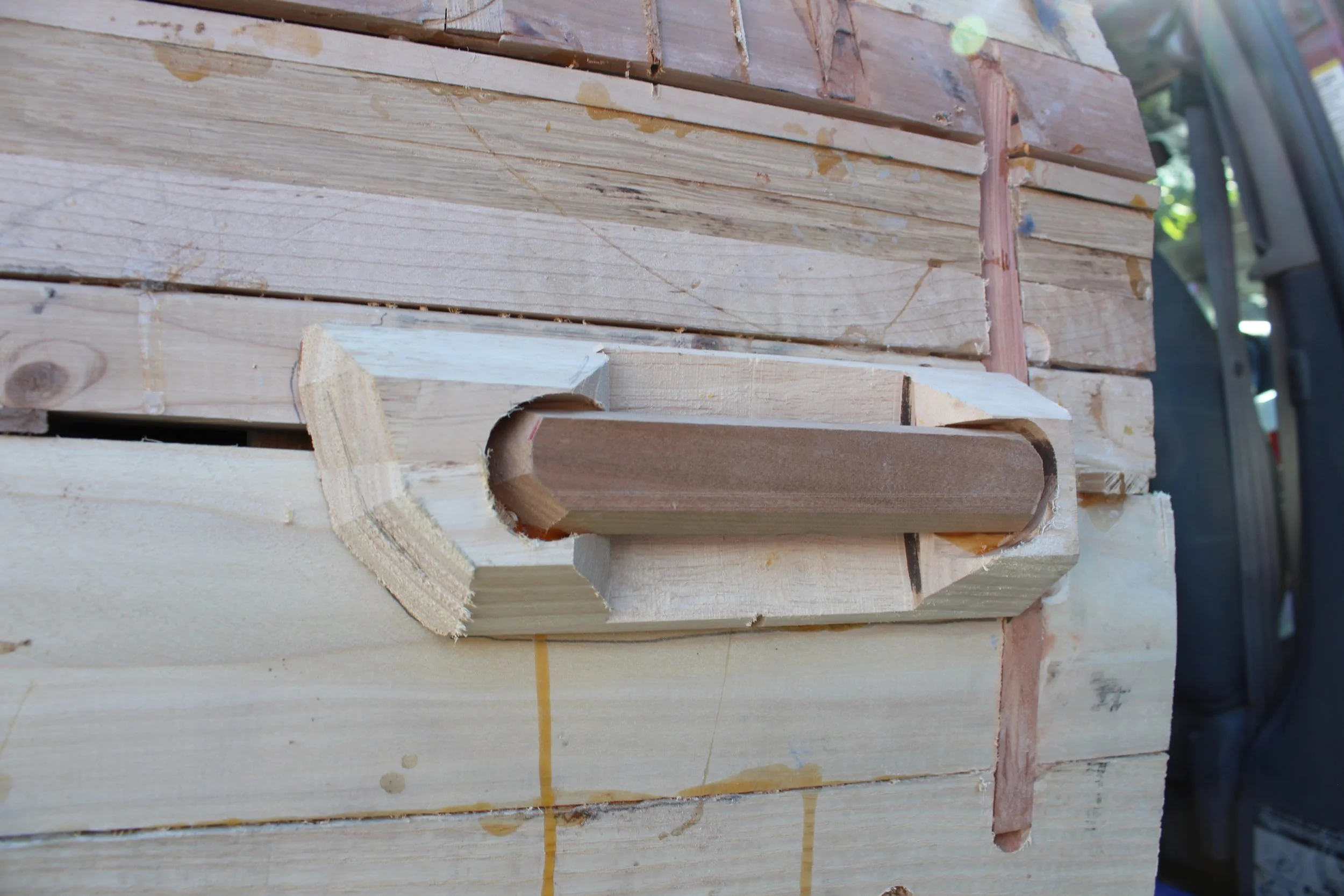 Today, the van doubles as Milligan’s fabrication hub, often seen loaded with 2x4s, pedestals, and an eclectic mix of tools, cassettes, CDs, wood dust, and moving blankets. It evokes the chaotic charm of Peanuts’ Pigpen: less a vehicle, more a traveling character study. Propping up the back hatch is one of Milligan's artworks, made from scrap wood and joint compound, titled Dutches Bicycles (We Fix Anything but Broken Parts)—a tribute to his grandpa's old bike shop sign. A bike tire crowns the piece, whose tombstone-like shape feels both memorial and mischievous. It exemplifies Milligan's signature process: casting large slabs of plaster, breaking them apart, and constructing wooden frames around each fragment in a collage of joinery techniques.