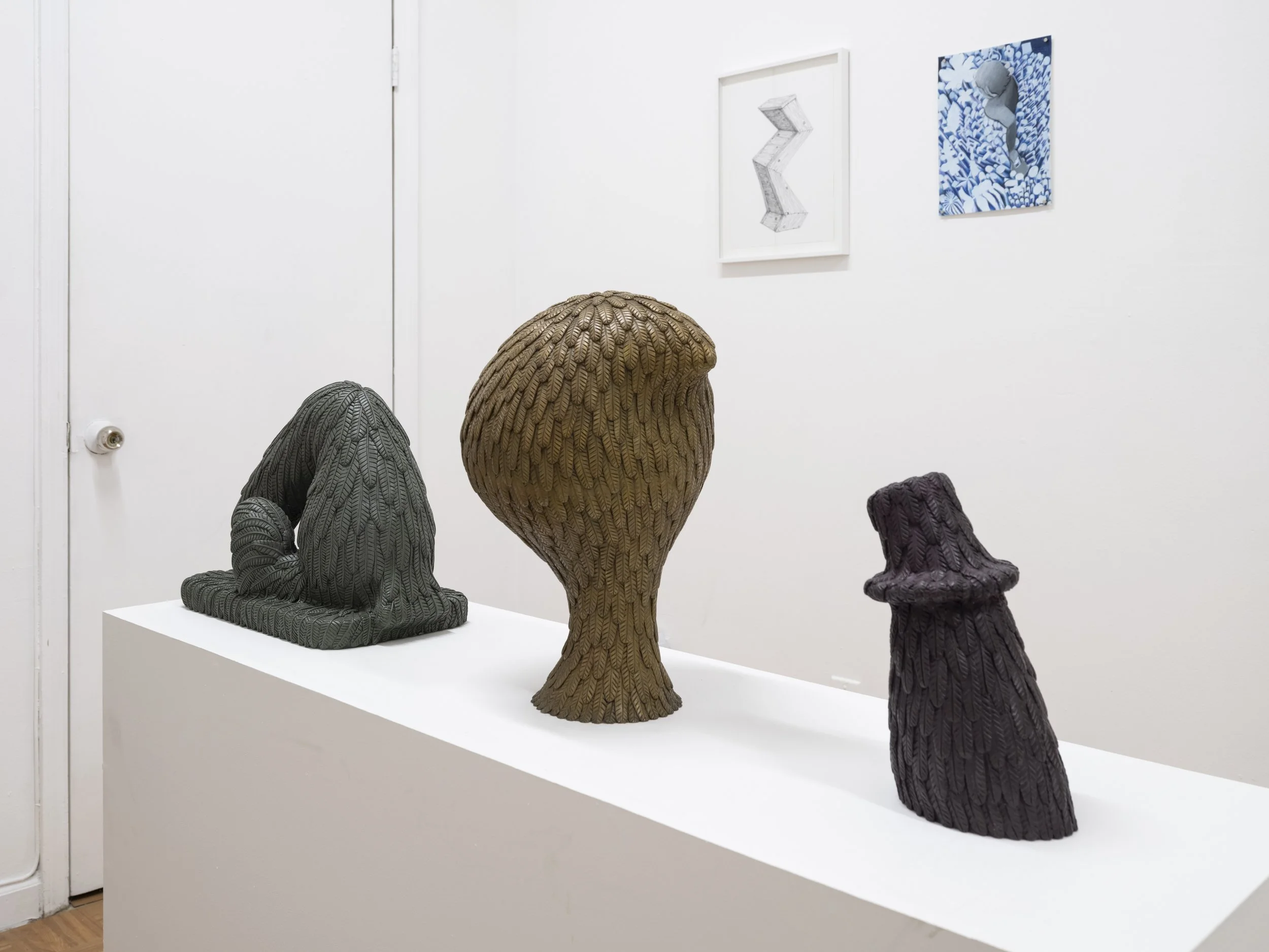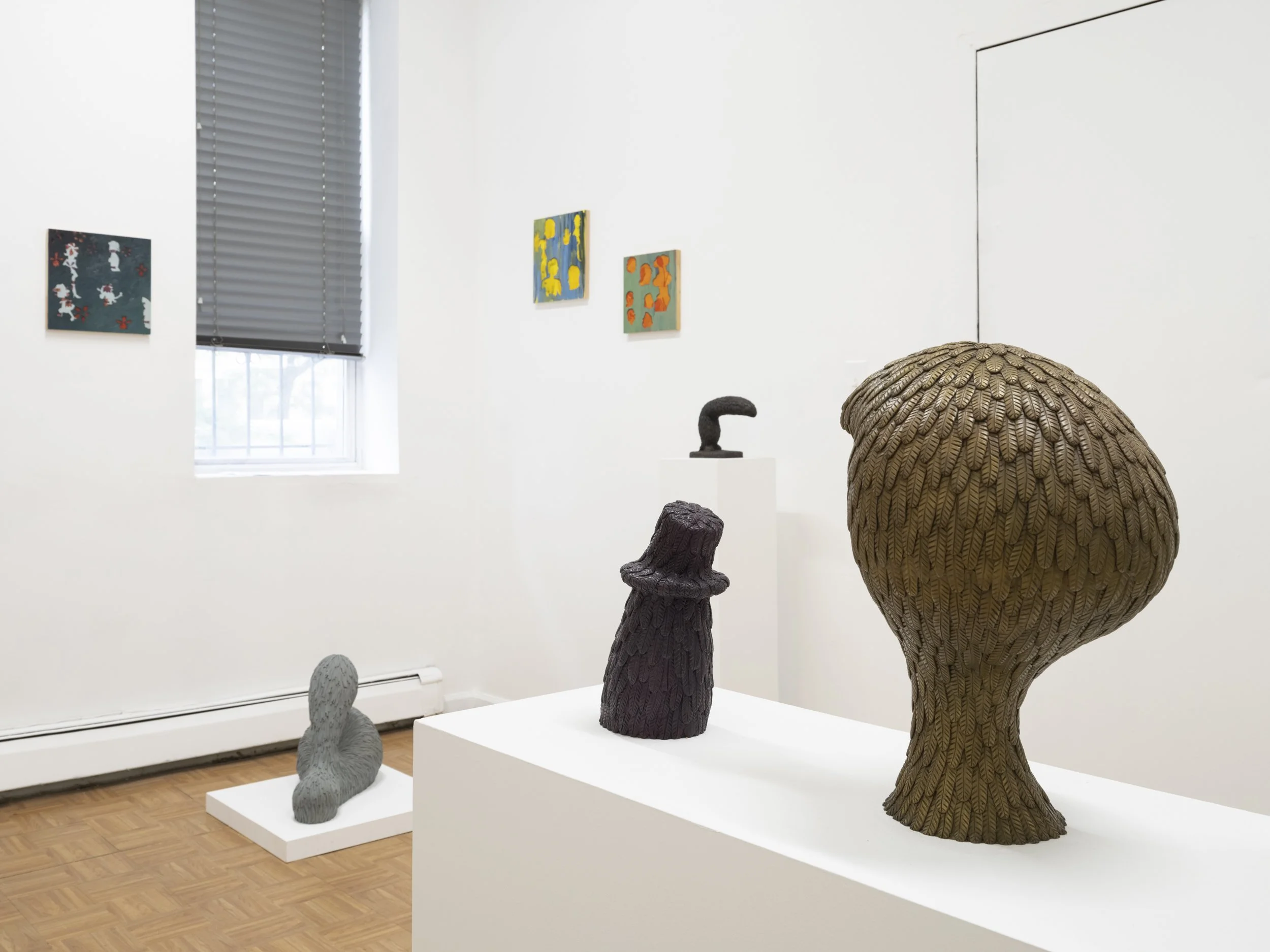 Between Carl’s sculpture and Kalina’s paintings, we see disparate modes of making converge with a sense of skewed whimsy and uncanny world-building. Embodied characters drawn from a foggy folk-pop lexicon dominate both artist’s work. Kalina’s paper-doll-like figures, and Carl’s overgrown critters seem to share an origin in the attic, or the thrift shop toy aisle. Our collective memory is easily endeared by the charm of misfit toys; these weird little guys feel almost alive. The asynchronous yields its own sweet harmony. But how sweet is this work, really? The familiarity hits immediately, but the longer we look, the less sure of what we’re really looking at. No answers emerge from prolonged gazing, just more tessellated connections between surface, depth, and form.